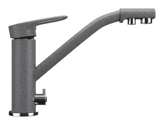 Высокоэргономичный кухонный смеситель с дополнительным краном для подключения фильтрованной воды, оснащенный кран-буксой с керамическими пластинами. Реализован тройной подвод воды через один излив: холодная, горячая и фильтрованная. Переход с одного подвода на другой производится поворотом рычага. Набор для соединения с фильтром входит в комплект. Система фильтрации приобретается дополнительно и монтируется под мойку, специальный индикатор сообщает о необходимости замены картриджа. Материал корпуса выполнен из высококачественной латуни, а окрашивание под искусственный камень в цвет мойки ULGRAN выполняется на собственном производстве, что позволяет идеально попасть в фирменный цвет ULGRAN. В качестве керамического картриджа используется известный бренд Wanhai диаметром 35 мм с высокой пропускной способностью в 500 тысяч циклов открывания-закрывания. На подвижные части картриджа Wanhai нанесена специальная невымываемая силиконовая смазка, а керамические пластины изготовлены из 96 процентов оксида алюминия, что, в сочетании с высоким качеством шлифовки обеспечивает долговечность, надежность, плавность хода рукоятки. Смеситель оборудован съемным пластиковым аэратором для экономии воды и поворотным изливом на 360 градусов. В комплектацию входят: керамический картридж Wanhai, гибкая подводка, комплект крепежных элементов, кран-букса с керамическими пластинами для дополнительного излива для фильтрованной воды, набор для подсоединения фильтра питьевой воды (гибкая подводка + переходник-цанга), технический паспорт и гарантийный талон.Заводская