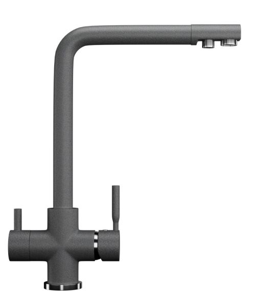 Высокоэргономичный кухонный смеситель с дополнительным краном для подключения фильтрованной воды, оснащенный кран-буксой с керамическими пластинами. Реализован тройной подвод воды через один излив: холодная, горячая и фильтрованная. Переход с одного подвода на другой производится поворотом рычага. Набор для соединения с фильтром входит в комплект. Система фильтрации приобретается дополнительно и монтируется под мойку, специальный индикатор сообщает о необходимости замены картриджа. Материал корпуса выполнен из высококачественной латуни, а окрашивание под искусственный камень в цвет мойки ULGRAN выполняется на собственном производстве, что позволяет идеально попасть в фирменный цвет ULGRAN. В качестве керамического картриджа используется известный бренд Wanhai диаметром 35 мм с высокой пропускной способностью в 500 тысяч циклов открывания-закрывания. На подвижные части картриджа Wanhai нанесена специальная невымываемая силиконовая смазка, а керамические пластины изготовлены из 96 процентов оксида алюминия, что, в сочетании с высоким качеством шлифовки обеспечивает долговечность, надежность, плавность хода рукоятки. Смеситель оборудован съемным пластиковым аэратором для экономии воды и поворотным изливом на 360 градусов. В комплектацию входят: керамический картридж Wanhai, гибкая подводка, комплект крепежных элементов, кран-букса с керамическими пластинами для дополнительного излива для фильтрованной воды, набор для подсоединения фильтра питьевой воды (гибкая подводка + переходник-цанга), технический паспорт и гарантийный талон.