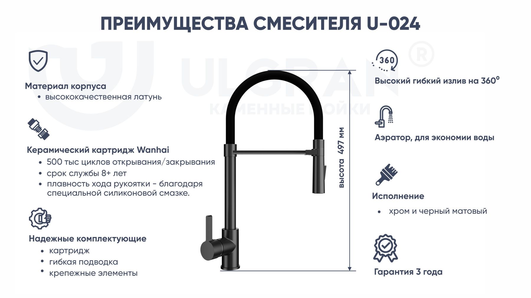 Смеситель ULGRAN U-024 – это стильный и современный кухонный смеситель с высоким гибким изливом черного цвета. Материал корпуса выполнен из высококачественной латуни, сверху корпус смесителя имеет специальное черное матовое покрытие.