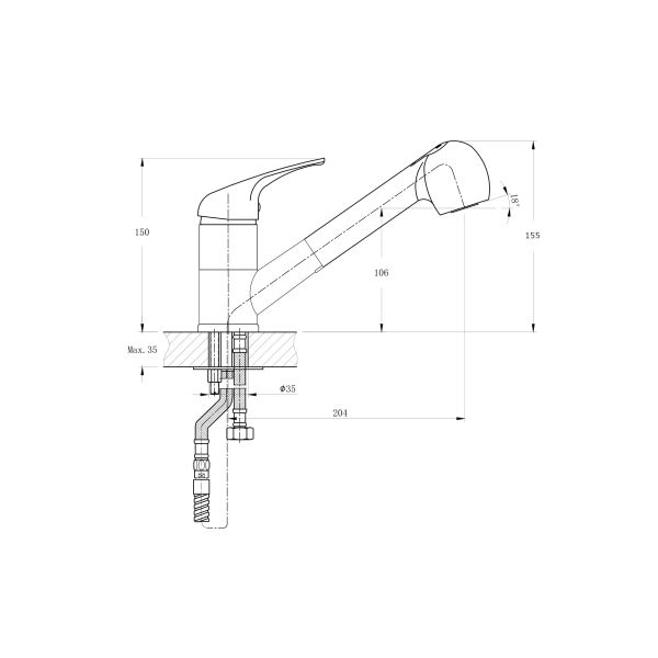 Смеситель для кухни с вытяжным изливом RUSH арт.CO4240-25 из коллекции Corsica c металлической ручкой имеет рычажное управление.В смеситель установлен картридж D-40 (RSH202) с керамическими пластинами. Высота смесителя 155 мм. Излив вытяжной поворотный 360гр, 204мм. Высота излива до аэратора 106 мм. Аэратор изготовлен из пластика с нержавеющим корпусом, угол наклона аэратора- 18 гр.В комплекте гибкая подводка с латунными гайками 35см - 2 шт, универсальная присоединительная группа (шпилька-2шт), шланг с латунными гайками 1,5м, фум-лента, индивидуальный пакет, паспорт, гарантийный талон.