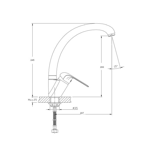 Смеситель для кухни с поворотным изливом RUSH арт.FI1835-22 из коллекции Fiji c металлической ручкой и имеет рычажное управление. В смеситель установлен картридж D-35 (RSH102) с керамическими пластинами. Высота смесителя 245 мм. Излив поворотный 360гр, 207 мм. Высота излива до аэратора 200 мм. Аэратор изготовлен из пластика с нержавеющим корпусом, угол наклона аэратора- 15 гр. В комплекте гибкая подводка с латунными гайками 35см - 2 шт, присоединительная гайка S-30мм, втулка-27мм, фум-лента, индивидуальный пакет, паспорт, гарантийный талон.