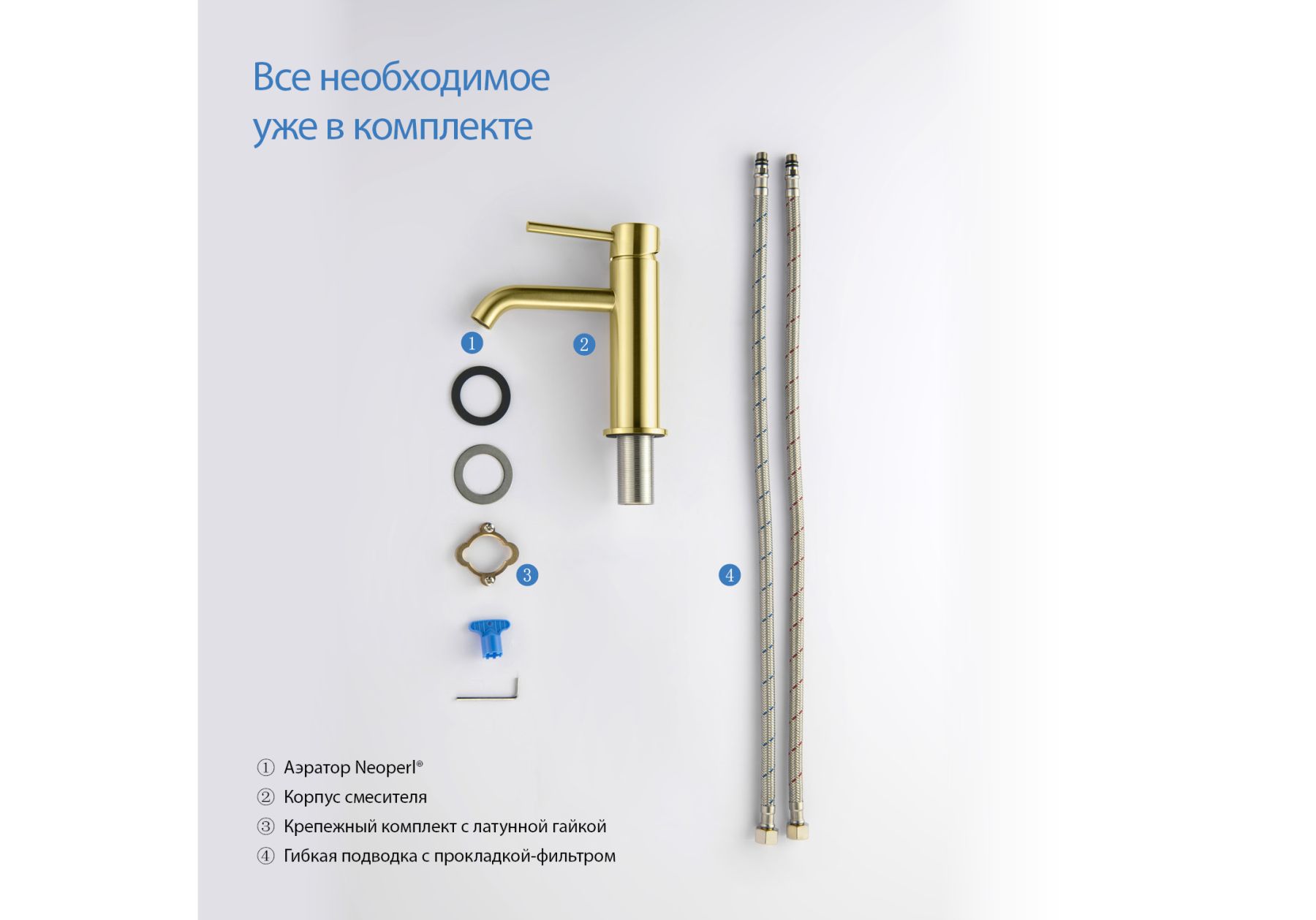В комплект входят все необходимые крепления и подводка 60 см в металлической оплетке, что делает установку максимально простой и удобной. Подводка дополнительно оснащена прокладкой с сетчатым фильтром.