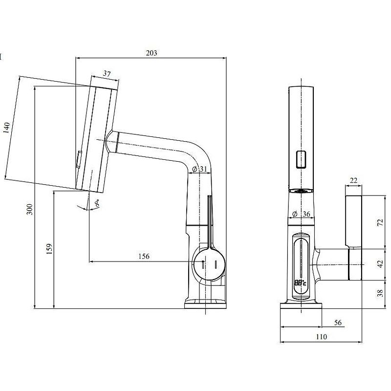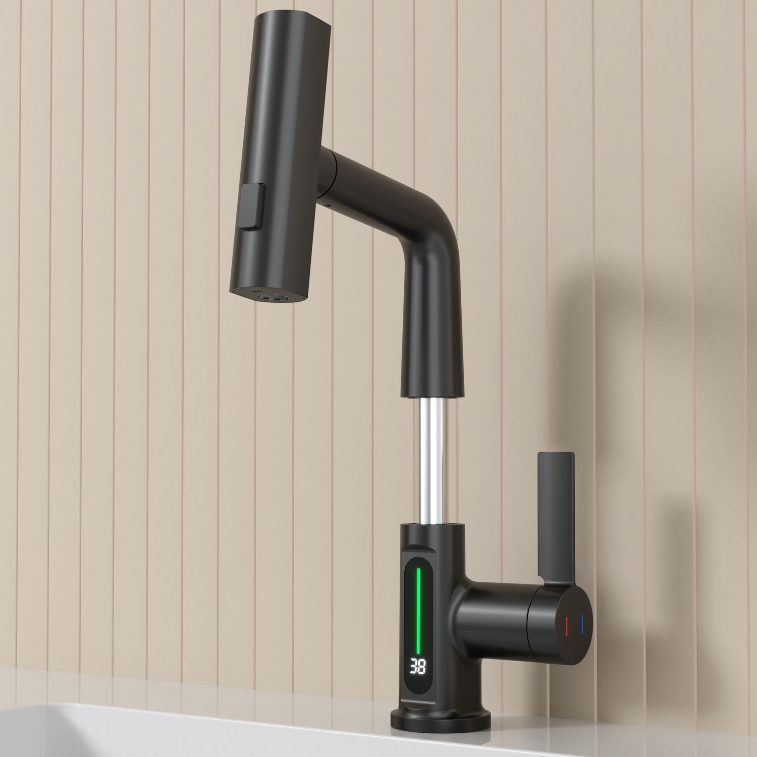 Смеситель для раковины датского производителя Black&White в черном матовом цвете. Корпус изделия выполнен из сантехнической латуни для увеличенного запаса прочности, а также исключает возможность появление коррозии. Управление потоком воды осуществляется с помощью керамического картриджа повышенной пропускной способности. Инновационным решением можно отметить электронное табло, расположенное в нижней части корпуса, на которое выводится показание температуры воды с подсветкой красного, зеленого и синего цвета. В данном продукте реализован многофункциональный излив с возможностью настройки высоты и длинны с помощью вытяжного шланга. Аэратор смесителя оборудован несколькими видами подачи воды, которые переключаются с помощью кнопки расположенной сверху корпуса.