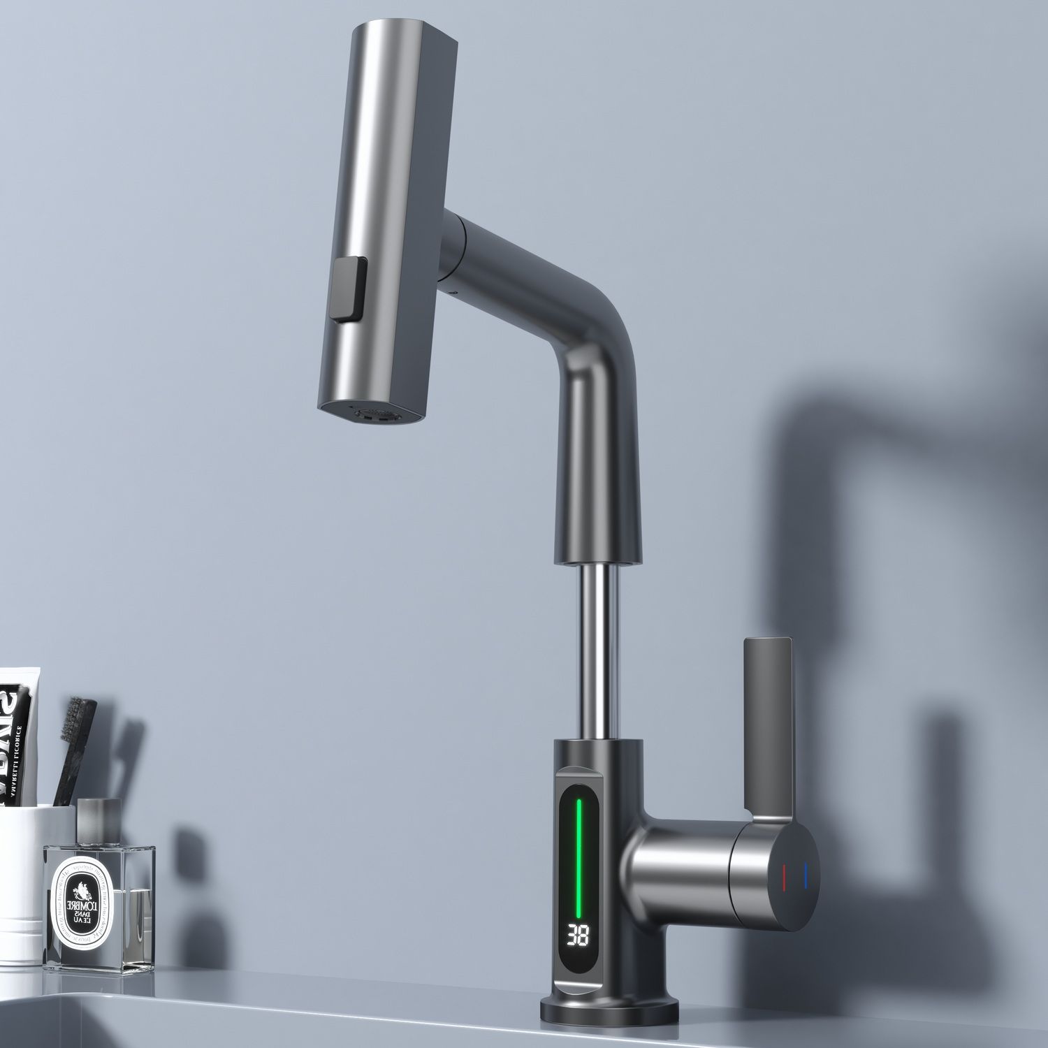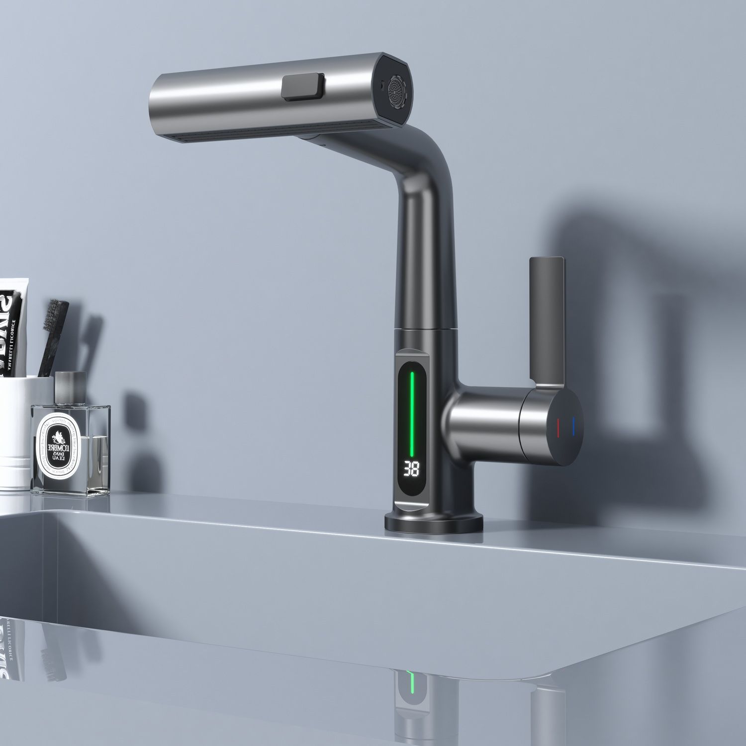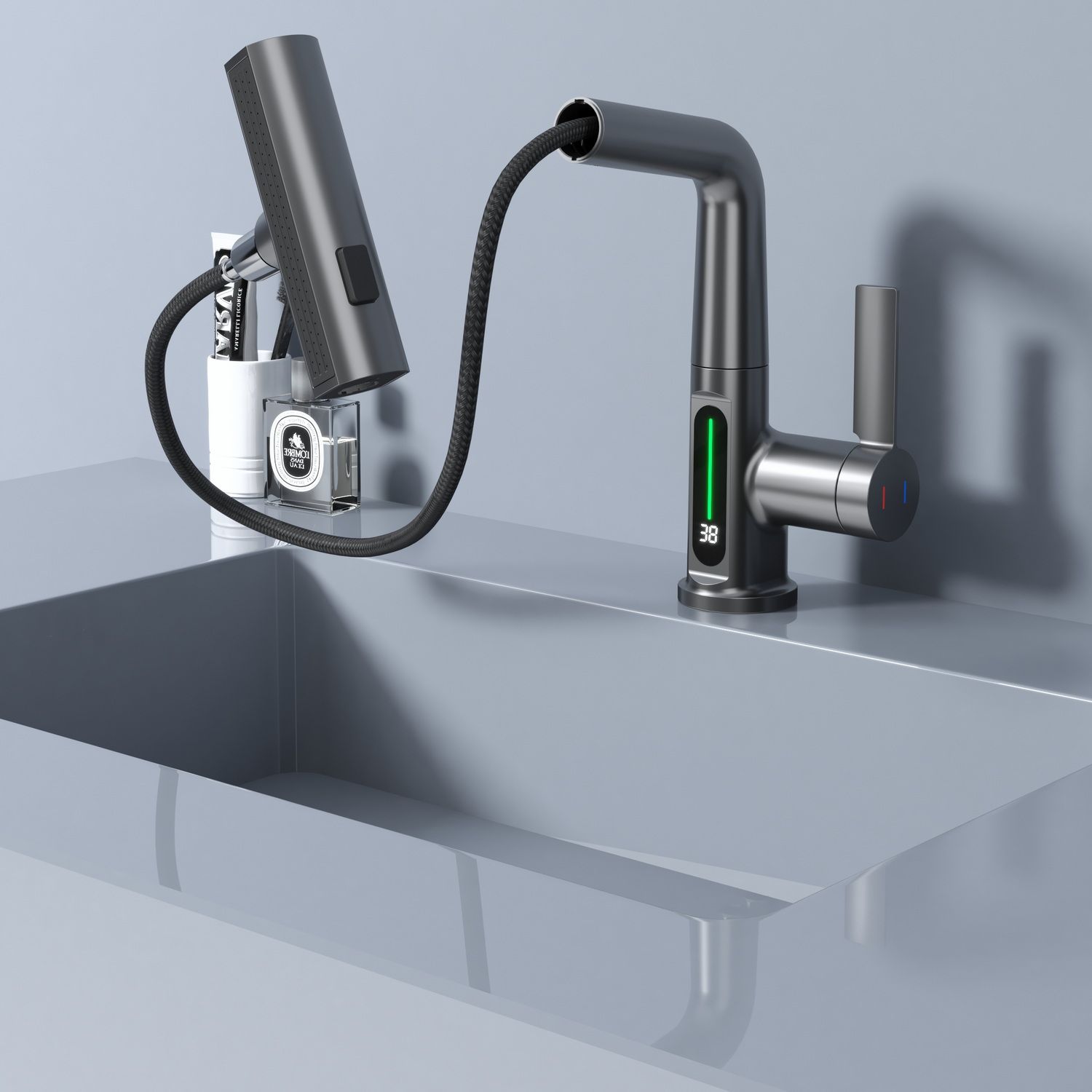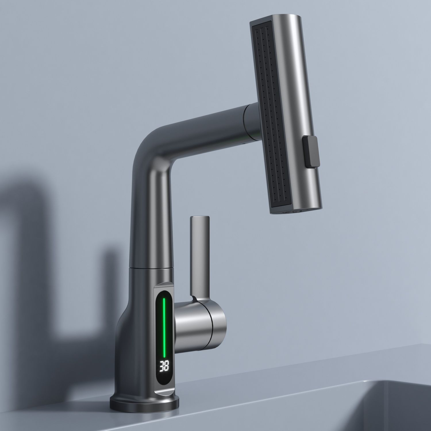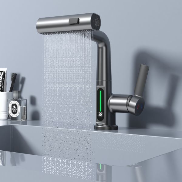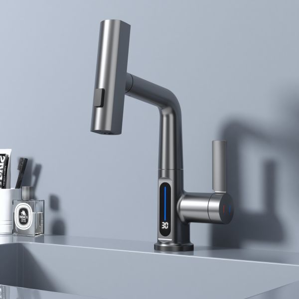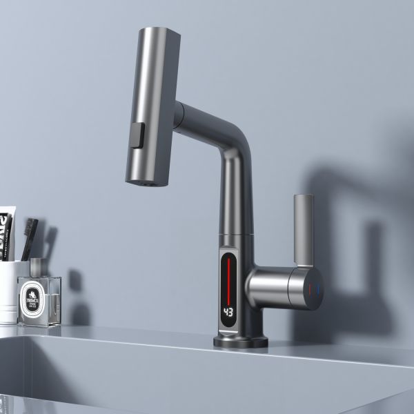 Смеситель для раковины датского производителя Black&White в цвете оружейная сталь. Корпус изделия выполнен из сантехнической латуни для увеличенного запаса прочности, а также исключает возможность появление коррозии. Управление потоком воды осуществляется с помощью керамического картриджа повышенной пропускной способности. Инновационным решением можно отметить электронное табло, расположенное в нижней части корпуса, на которое выводится показание температуры воды с подсветкой красного, зеленого и синего цвета. В данном продукте реализован многофункциональный излив с возможностью настройки высоты и длинны с помощью вытяжного шланга. Аэратор смесителя оборудован несколькими видами подачи воды, которые переключаются с помощью кнопки, расположенной сверху корпуса.