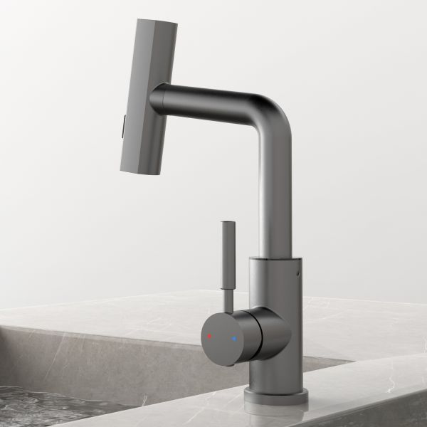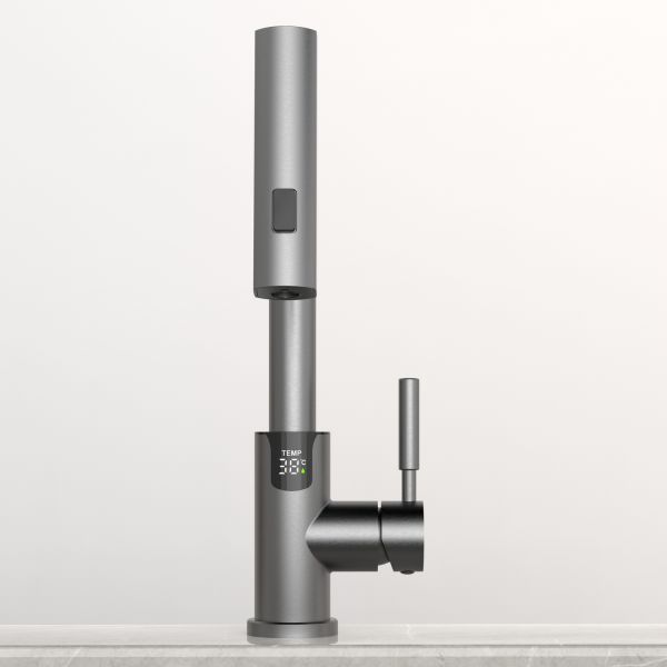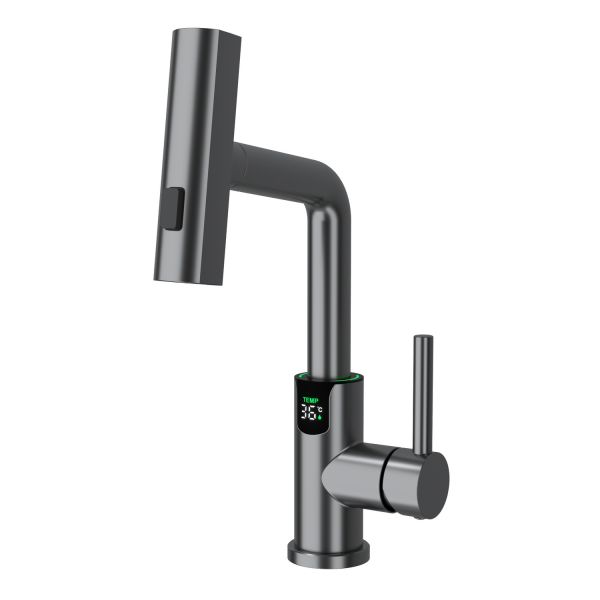 Смеситель для раковины датского производителя Black&White в цвете оружейная сталь. В корпусе изделия прослеживаются нотки классических форм и современного стиля. Изготавливается из сантехнической латуни для увеличенного запаса прочности и исключения вероятности появление коррозии. Управление потоком воды осуществляется с помощью керамического картриджа повышенной пропускной способности. Инновационным решением можно отметить электронное табло, расположенное в нижней части корпуса, на которое выводится показание температуры воды с подсветкой красного, зеленого и синего цвета. В данном продукте реализован многофункциональный излив с возможностью настройки длинны с помощью вытяжного шланга. Аэратор смесителя оборудован несколькими видами подачи воды, которые переключаются с помощью кнопки расположенной сверху корпуса.