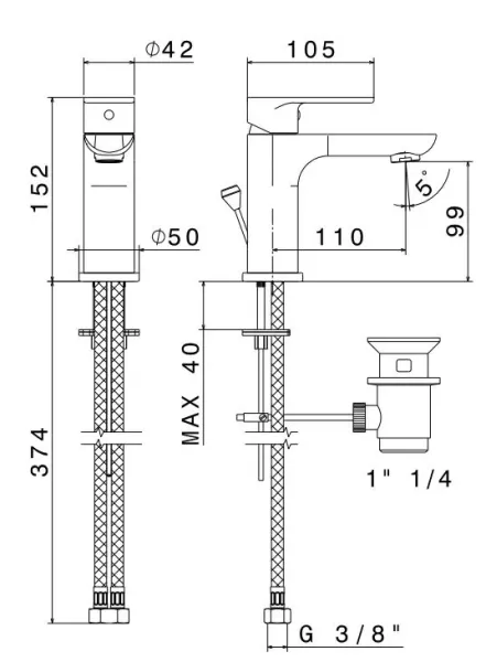 Однорычажный смеситель для раковины, с 1" 1/4 слива. Соединение 3/8".