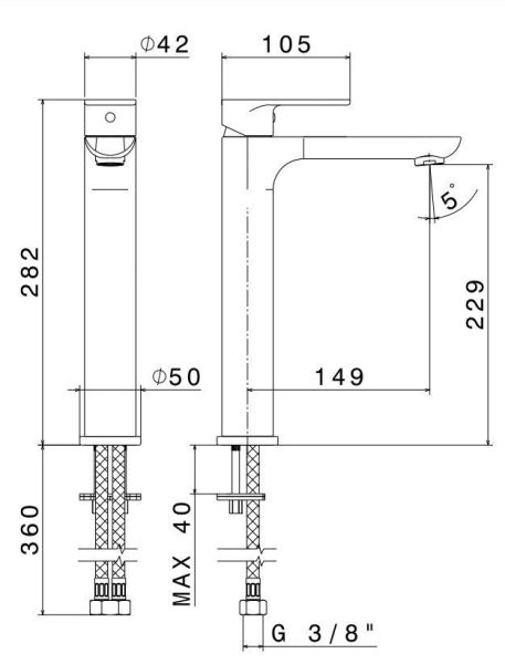 Однорычажный смеситель для раковины, высокий, с установкой на столешницу, без донного клапана. Соединение 3/8".