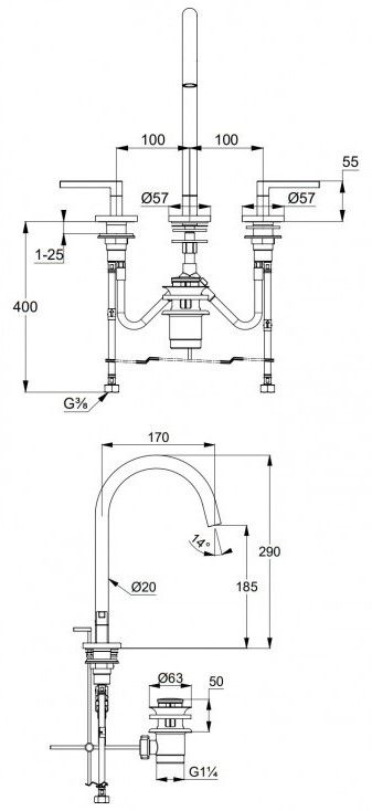 Смеситель для раковины Kludi Nova Fonte Puristic на три отверстия чёрный матовый 201433915
