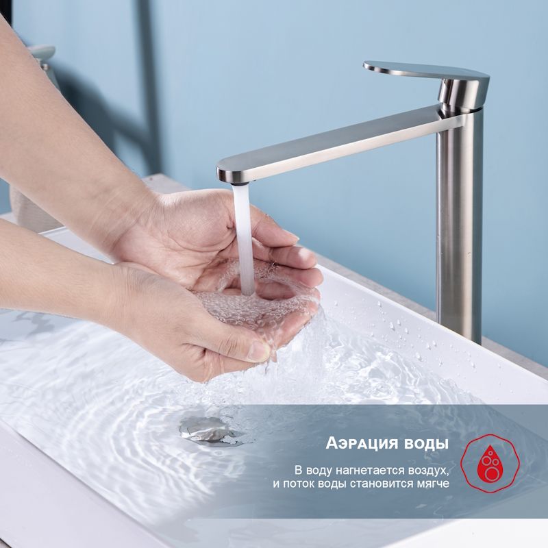 Излив оснащён аэратором, который помогает экономить воду, создавая мягкий и равномерный поток. Крепление смесителя осуществляется при помощи гайки, что обеспечивает надёжную фиксацию на раковине.