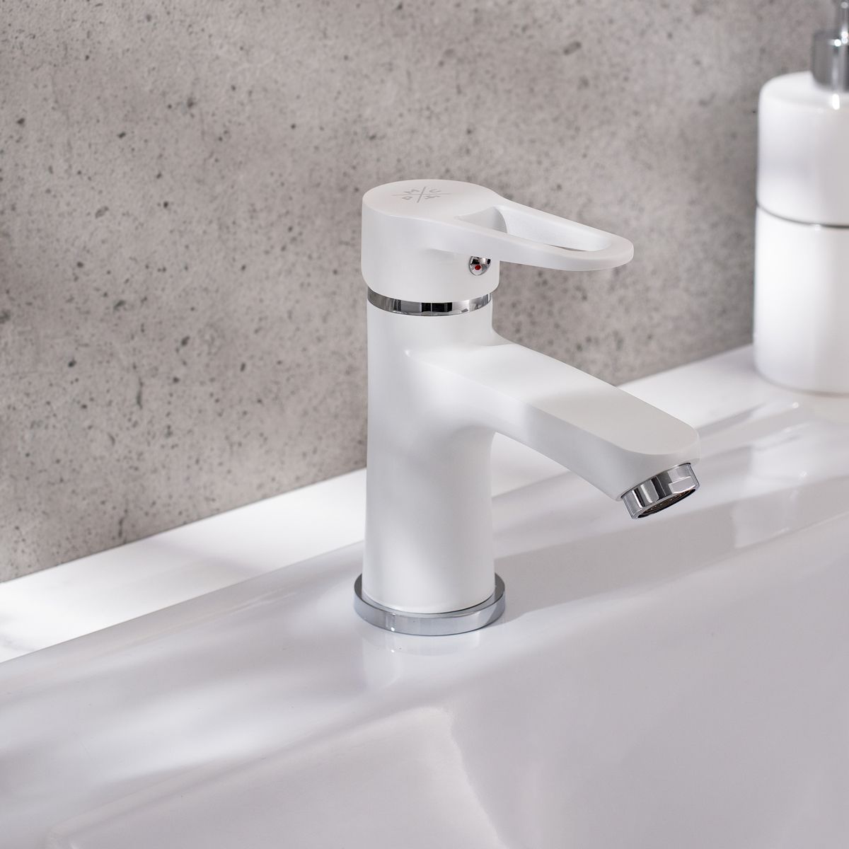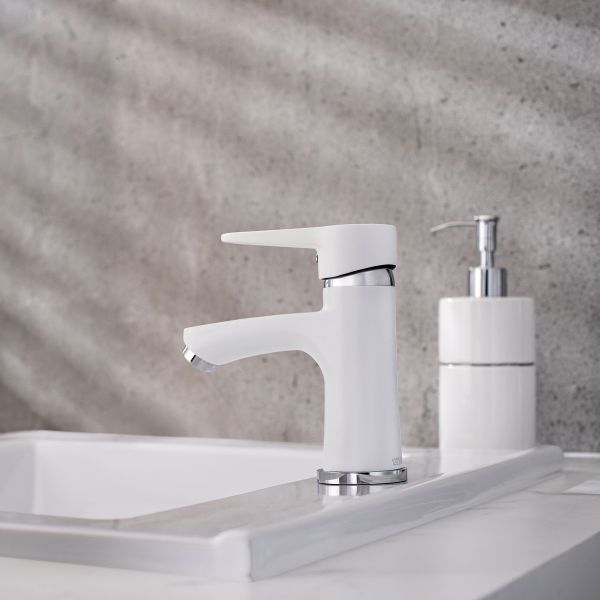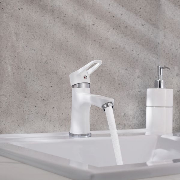 Изящный однорычажный смеситель для умывальника выполнен в классическом белом цвете и станет стильным украшением вашего интерьера.