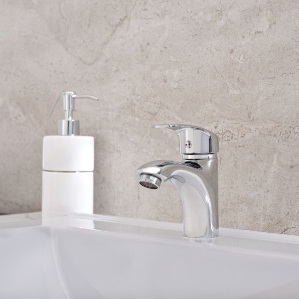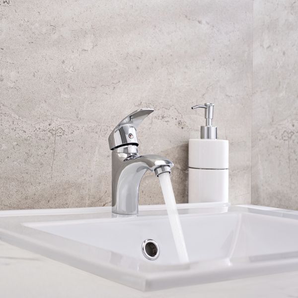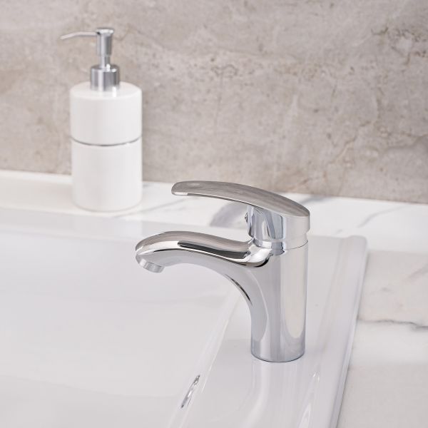 Аккуратный однорычажный смеситель для умывальника с хромовым покрытием станет стильным решением для негабаритной раковины.