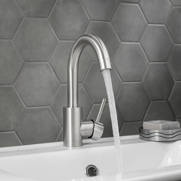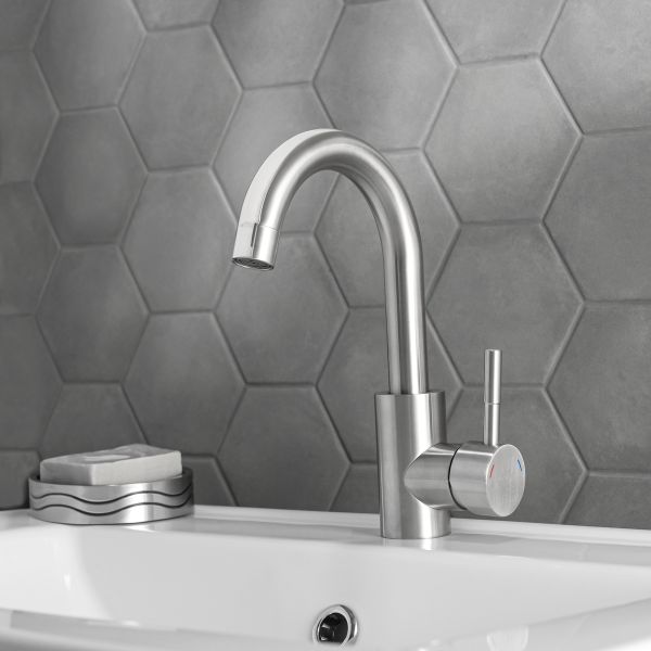 Одноручковый смеситель для умывальника из нержавеющей стали с высоким изливом станет привлекательным и функциональным атрибутом ванной комнаты.
