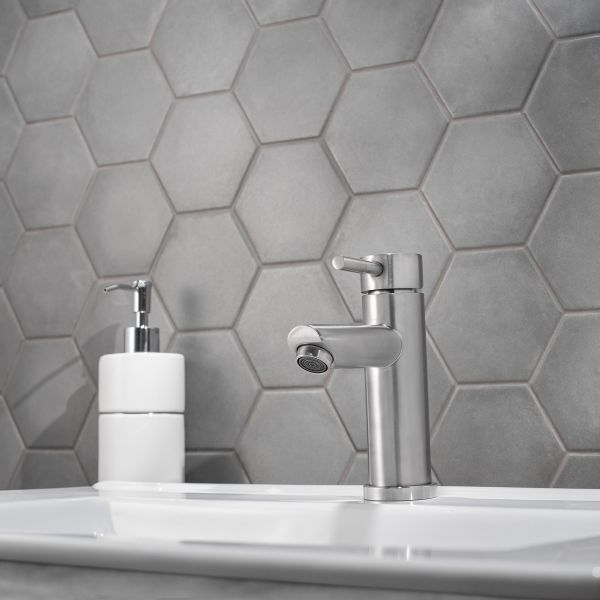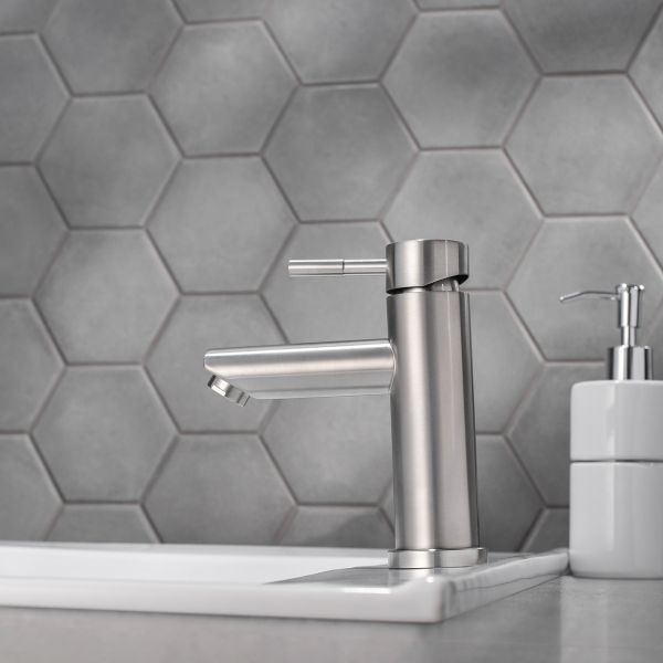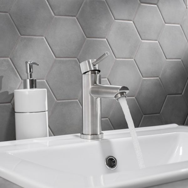 Оригинальный однорычажный смеситель для умывальника из нержавеющей стали станет стилистическим центром внимания.