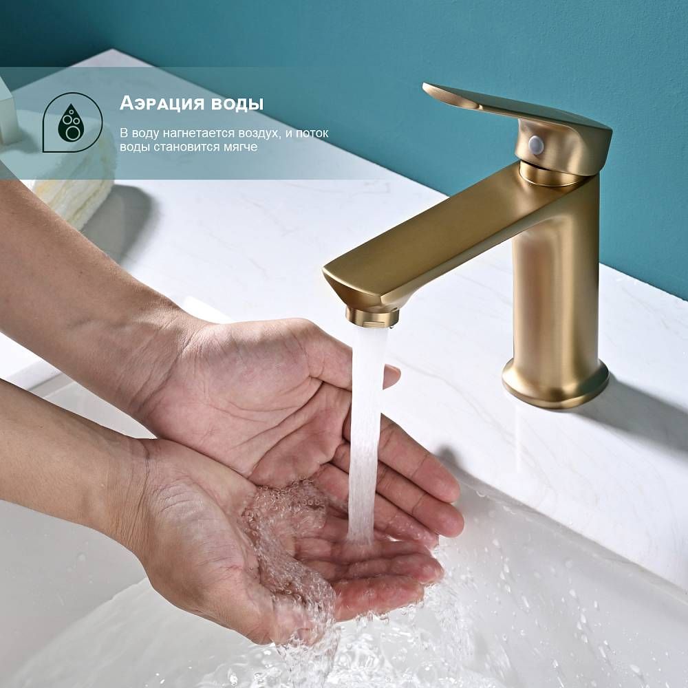 Смеситель для раковины Splenka S30.10.03, сатин золотой. Смеситель для раковины Splenka имеет повышенную прочность корпуса. Соответствует требованиям международного стандарта. Одна рукоять для регулировки воды. Аэратор гарантирует одинаковый поток воды, сеточка рассеивает напор, вода смягчается. Смеситель устанавливается на гайке, нижняя часть смесителя вставляется в отверстие для монтажа и затягивается гайкой для фиксации. Данный смеситель для умывальника имеет надежный стационарный излив, не меняющий своего положении. Смеситель прекрасно смешивает потоки воды, а помимо этого обладает невысоки показателем шумов. Быстрый монтаж. Гарантия производителя 5 лет.