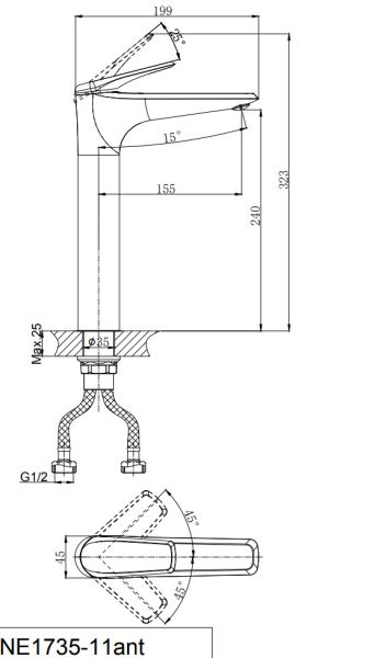 Смеситель для раковины RUSH арт. NE1735-11ant с металлической ручкой из коллекции Nevis изготовлен из высококачественной латуни и имеет рычажное управление.В смеситель установлен картридж D-35 с керамическими пластинами. Высота смесителя 323 мм. Излив литой неповоротный 199 мм. Высота излива до аэратора 240 мм. Аэратор изготовлен из пластика с нержавеющим корпусом, угол наклона - 15 гр. В комплекте универсальная присоединительная группа для установки на горизонтальную поверхность, гибкая подводка с латунными гайками 40 см - 2шт, фум-лента, индивидуальный пакет, паспорт, гарантийный талон.