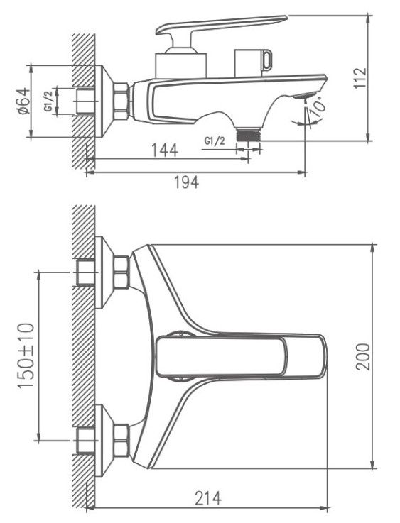 Керамический картридж 35 мм.Диаметр декоративных чашек 70 мм.Душевой гарнитур в комплекте.Межосевое расстояние (расстояние между выходом горячей и холодной трубы) 150 мм.Данное расстояние изменяется за счет входящих в комплект эксцентриков на 10 мм в большую или меньшую стороны.