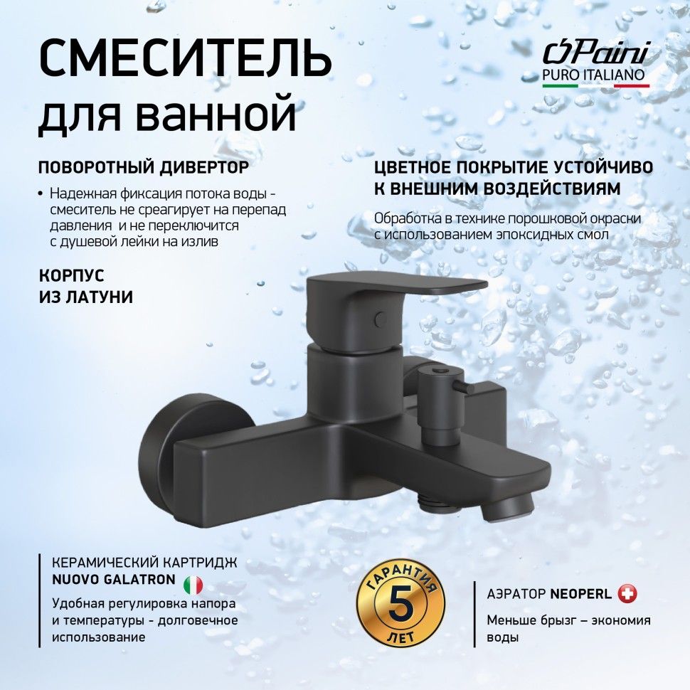 Однорычажный смеситель для ванны из новой коллекции VIVA STYLE от PAINI – четкие линии и современные технологии для вашего дома. Корпус смесителя сочетает в себе геометрию и изящество, что создает целостность формы.Качество от семейной итальянской фабрикиГарантия производителя 5 лет. Прослужит долго!Идеальный внешний вид надолгоЛатунный корпус устойчив к царапинам и химическим повреждениям. Модель в цвете черный YO выполнена из латуни, финишное покрытие в технике порошковой окраски с использованием эпоксидных смол.Европейские комплектующиеАэратор Neoperl увеличивает напор, что существенно экономит воду. Сеточка очищается пальцем. Nuovo Galatron - керамический картридж, обеспечивающий долгую службу смесителя.Поворотный (флажковый, рычажный) дивертор смесителя для ванной PAINI не среагирует на перепад давления воды и внезапно не переключится с душевой лейки на излив.