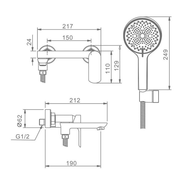 Смеситель для ванны Raglo Материал: латунь.Управление: однорычажное.Механизм: керамический картридж.Излив: поворотный. Аэратор.Форма ручного душа: круглая.Количество режимов струи ручного душа: 3.Отверстия для монтажа: 2.Монтаж: на стену.