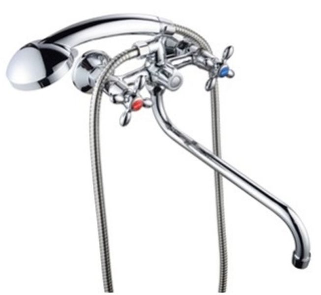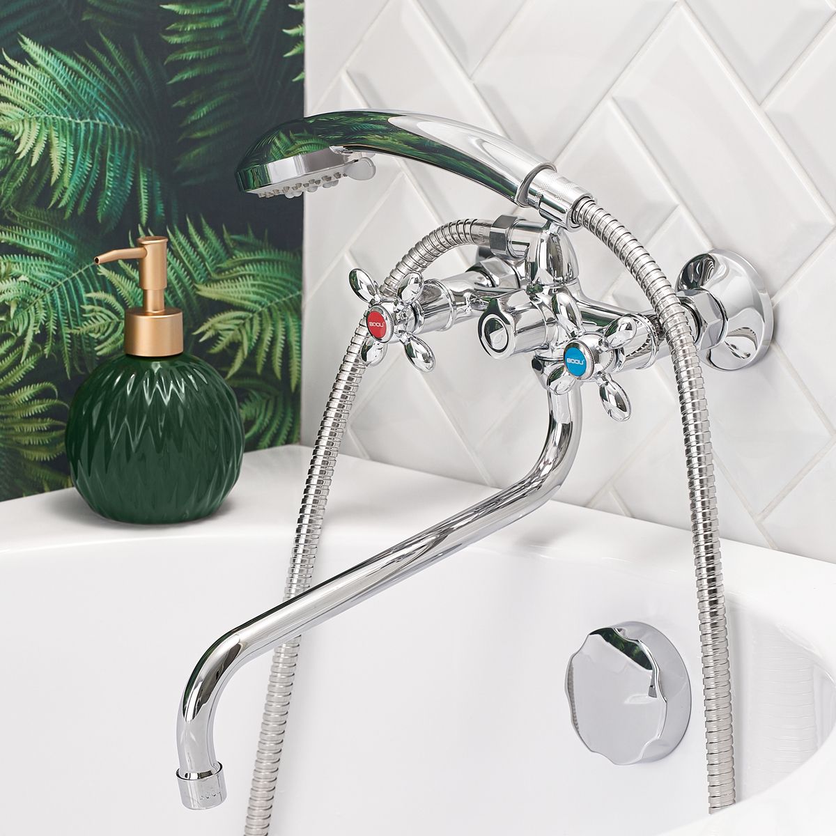 Стильный смеситель с двумя рукоятками ТМ BOOU избавит от лишних трат и поможет освободить место в ванной комнате. Модель оснащена длинным трубчатый изливом в форме буквы J, что позволяет удобно использовать его над раковиной и прилегающей к ней ванной. В комплекте удобная трехрежимная лейка с гибким шлангом и настенный держатель.