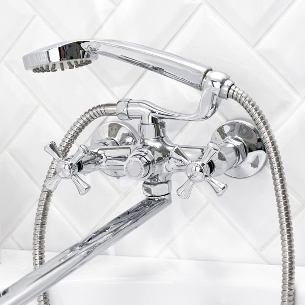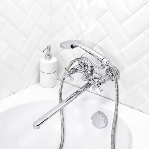 Современный двуручковый смеситель для ванны с длинным поворотным изливом притягивает внимание геометричностью линий и стильным хромированным покрытием.