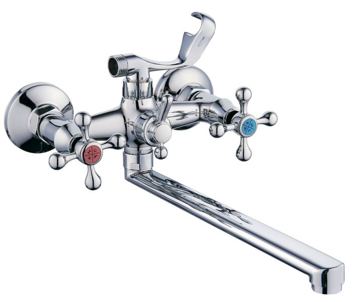 Двуручковый смеситель для ванны с длинным поворотным изливом — прекрасное решение для удобства в использовании и придания интерьеру стильного элемента.