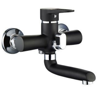 Однорычажный смеситель для ванны с коротким изливом выполнен в современном черном оттенке и станет эффектным элементом вашего интерьера.