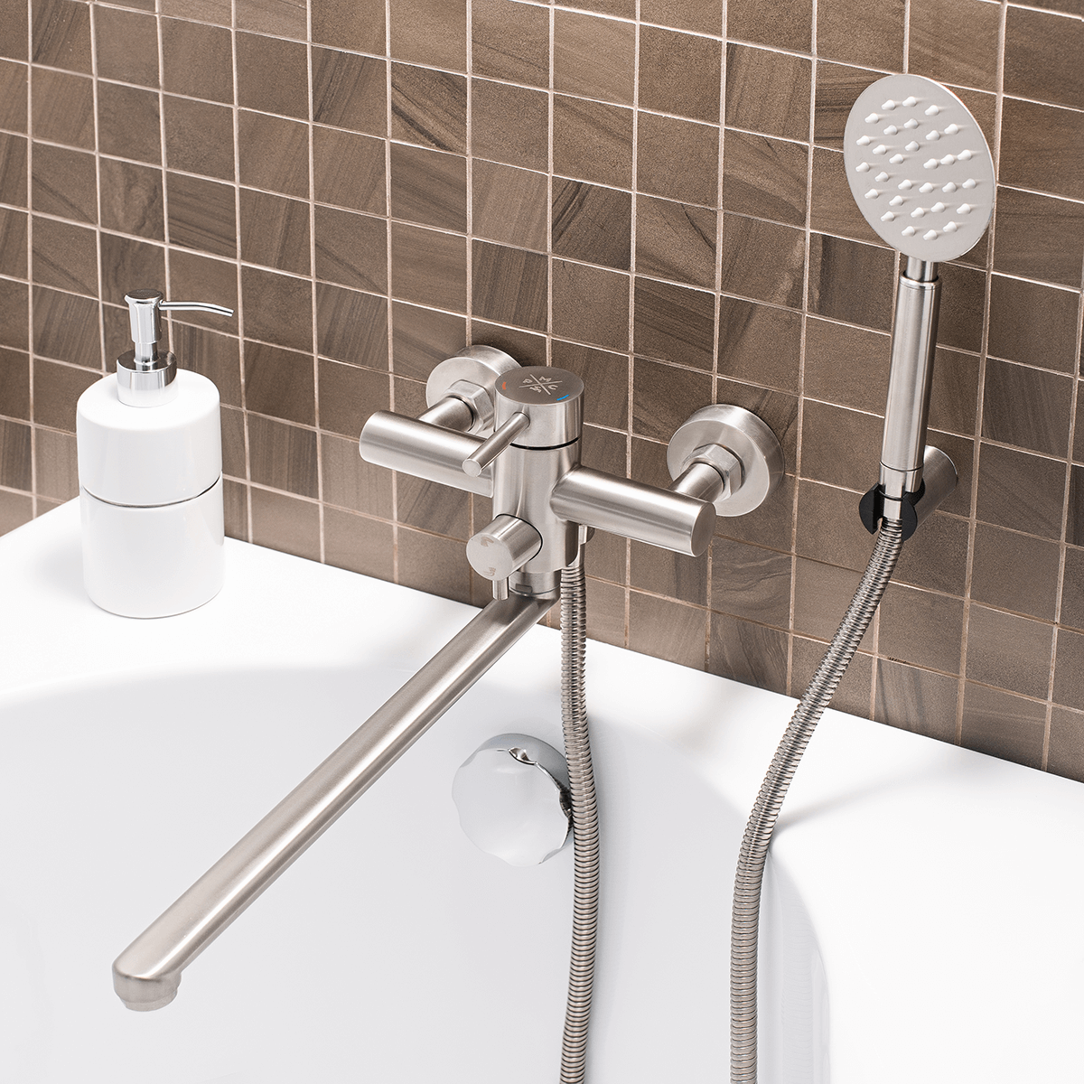 При производстве смесителей ТМ РМС используются только высококачественные материалы. Смесители серии SUS124 выполнены из нержавеющей стали, что является гарантией качества и долговечности, устойчивы к царапинам и перепадам температур, экологичны и безопасны для вашего здоровья, Поверхность не потеряет со временем свой роскошный вид, а уход за ней сводится к протиранию мягкой салфеткой. Установка смесителя крайне проста. Смесители РМС это сертифицированный продукт с 7-летней гарантией. В комплекте идут эксцентрики, отражатели, металлический шланг для душа 1,5м и лейка для душа.