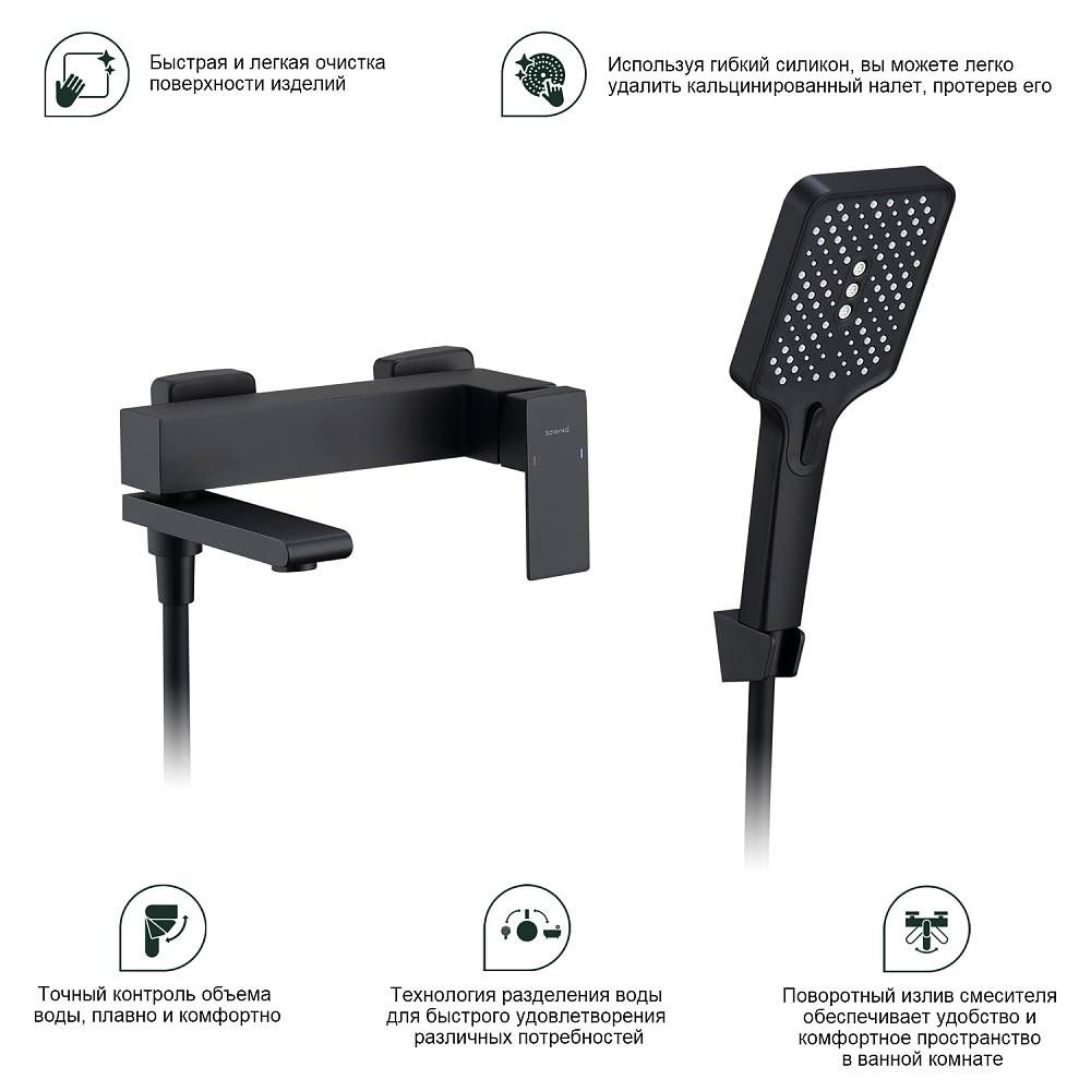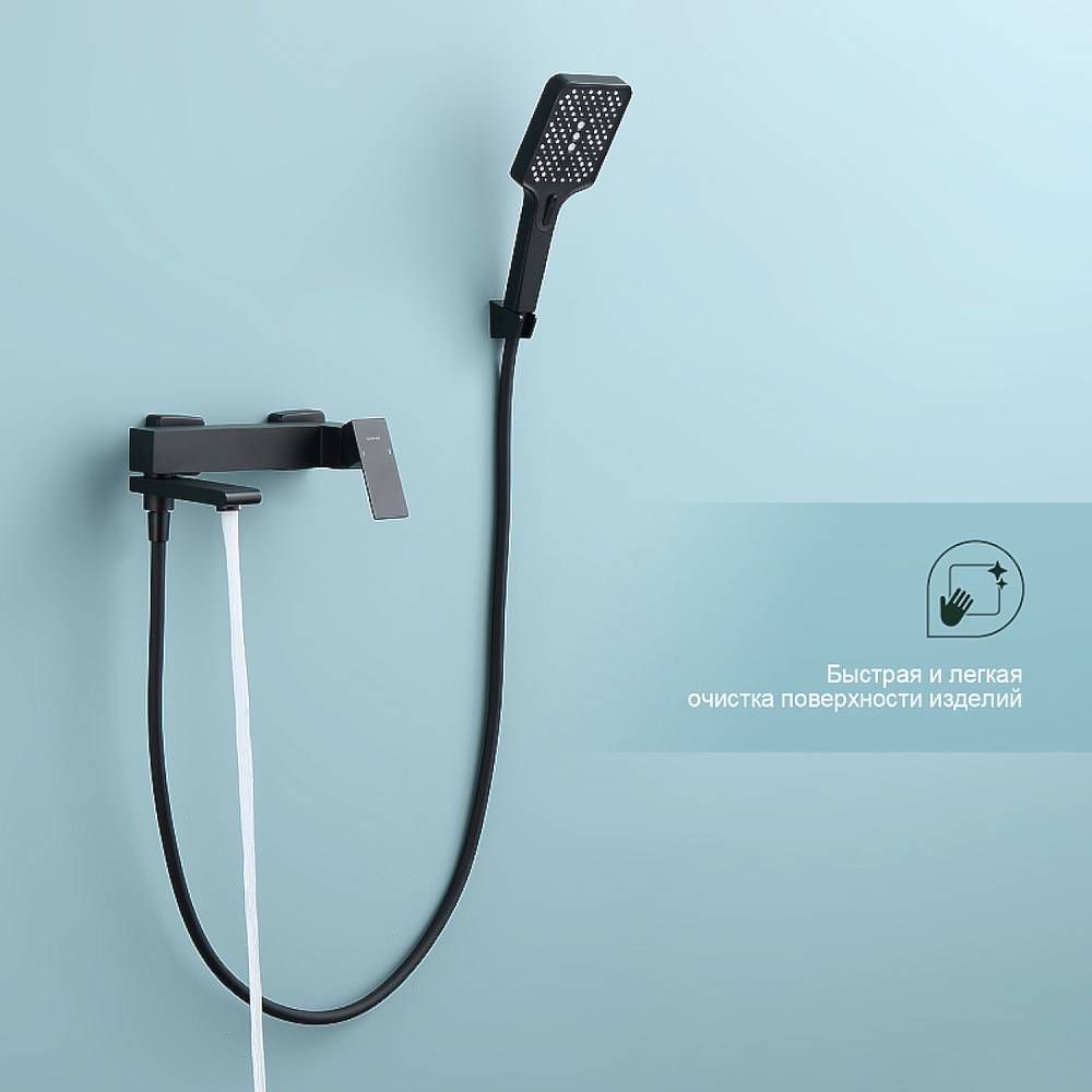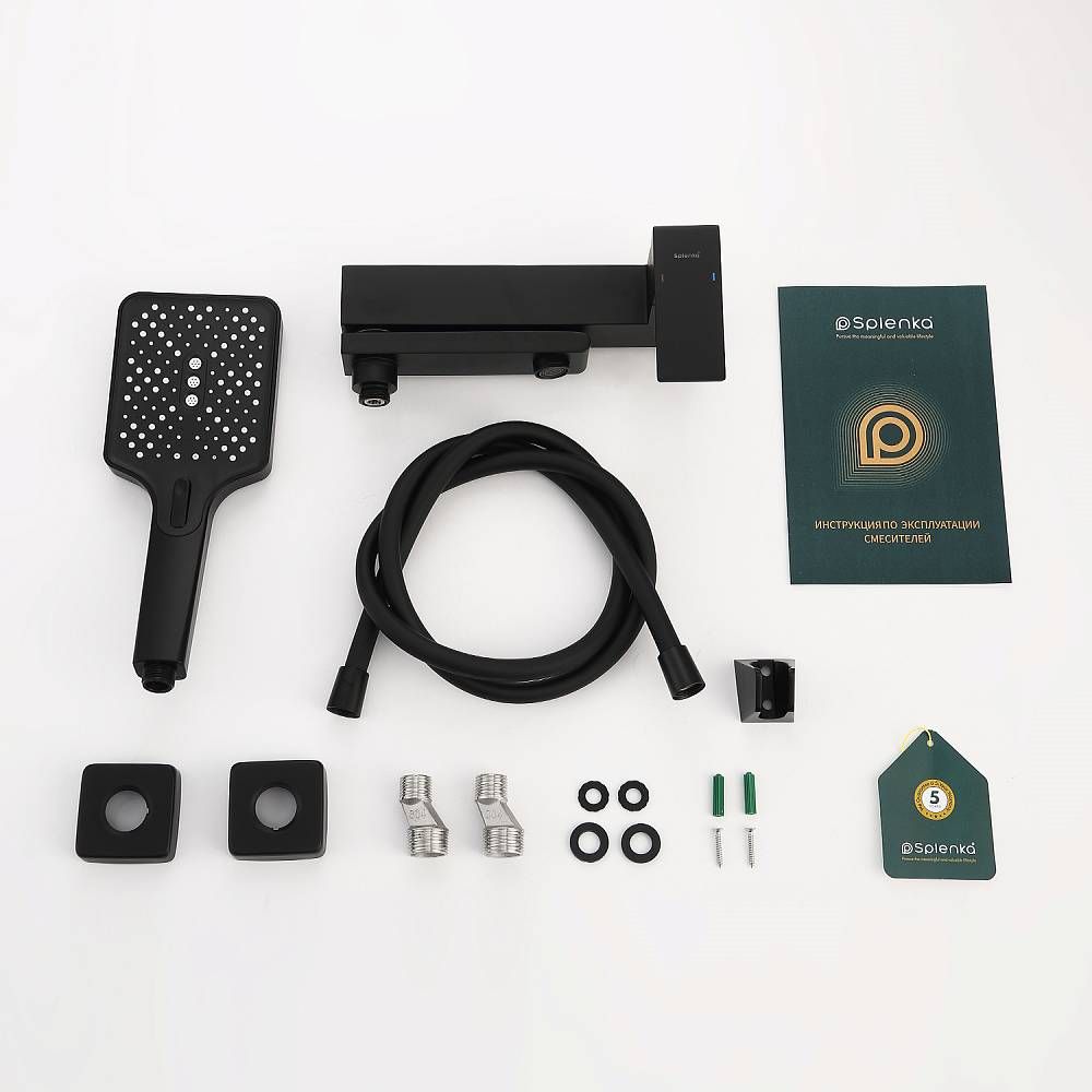 Смеситель для ванны Splenka S224.30.06 с душевым гарнитуром. Цвет: черный. Материал: латунь. Управление: однорычажное. Механизм: керамический картридж. Излив: поворотный. Аэратор. Стандарт подводки: G 1/2. Отверстия для монтажа: 2. Количество режимов струи: 3. Монтаж: на стену.