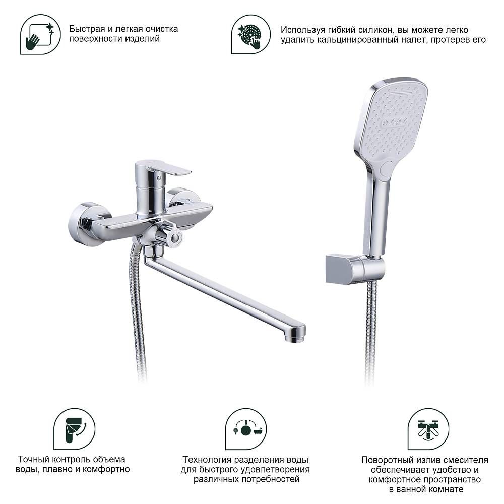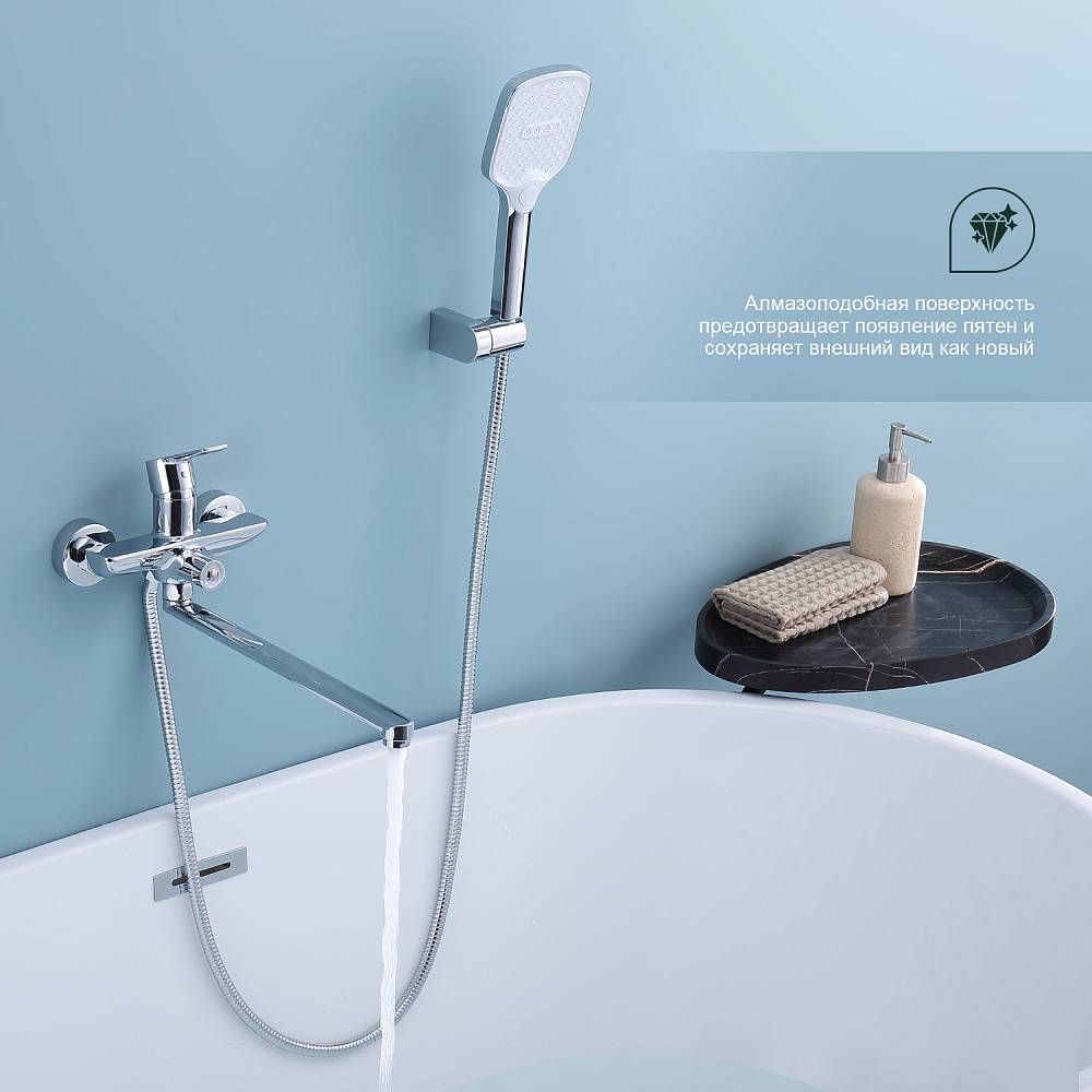 Смеситель для ванны Splenka S30.22 универсальный. Цвет: хром. Материал: латунь. Управление: однорычажное. Механизм: керамический картридж. Излив: поворотный. Стандарт подводки: G 1/2. Аэратор. Переключатель ванна/душ. Монтаж: на стену. Душевая лейка - 3 режима.