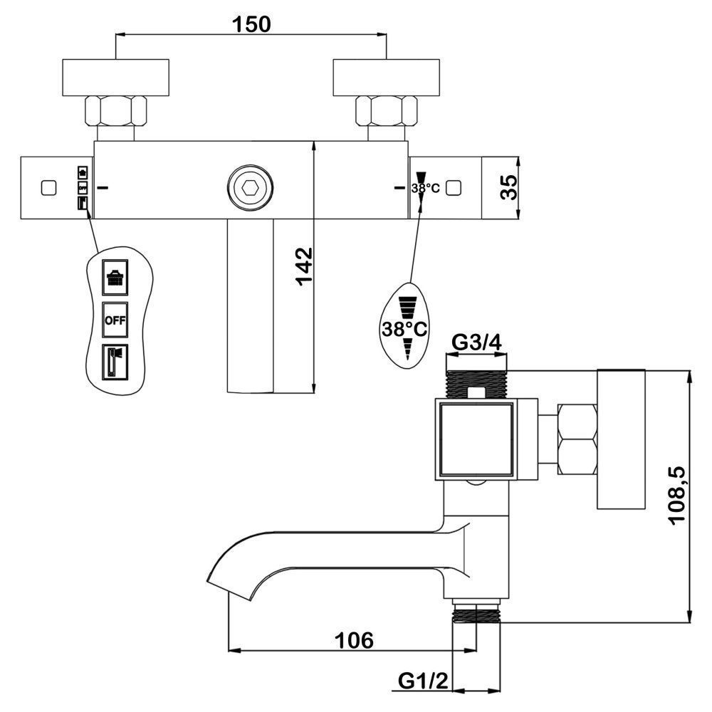Термостатический смеситель для ванны с поворотным изливом/дивертором и верхним подключениемКерамическая кран букса.Термостатический картридж с шумоподавлением.Обратные клапаны. Дивертор с фиксацией.Ограничитель температуры 38°.Эксцентрики и декоративные накладки.Гигиенически стабильная латунь с высоким содержанием меди.Цвет: черный