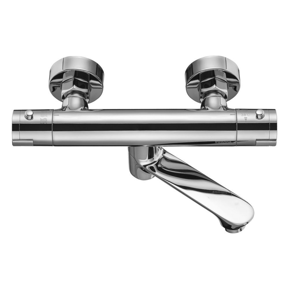 Термостатический смеситель для ванны с поворотным изливом Swedbe Mercury создан по шведским стандартам к эргономике и дизайну. Температура и напор воды устанавливается двумя рукоятками. Поворот излива к стене переключает воду на душ и освобождает дополнительное пространство. Термостат поддерживает заданную температуру и может работать даже в системах низкого давления, например, с газовыми проточными водонагревателями. Ограничитель температуры спасает от возможного ожога при случайном повороте рукоятки.