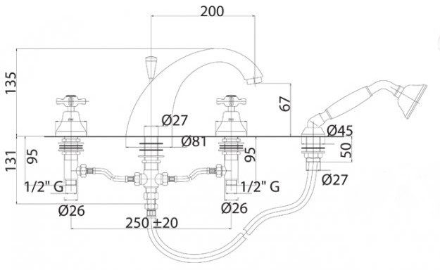 Смеситель на борт ванны с ручным выдвижным душем, золото Cezares LORD-BVD-03/24-Bi
