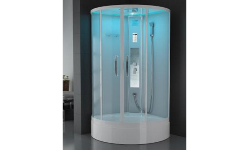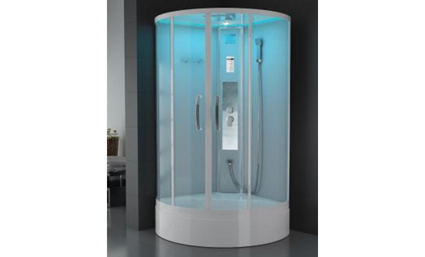Центральная панель – белое стекло с накладкой из нержавеющей стали с силиконовыми форсунками и смесителем из латуни;