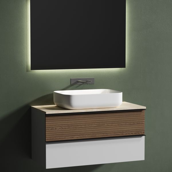 Столешница для ванной комнаты из керамогранита, для установки на подвесную тумбу. C готовым отверстием для установки накладной раковины. Без заранее просверленного отверстия под смеситель.