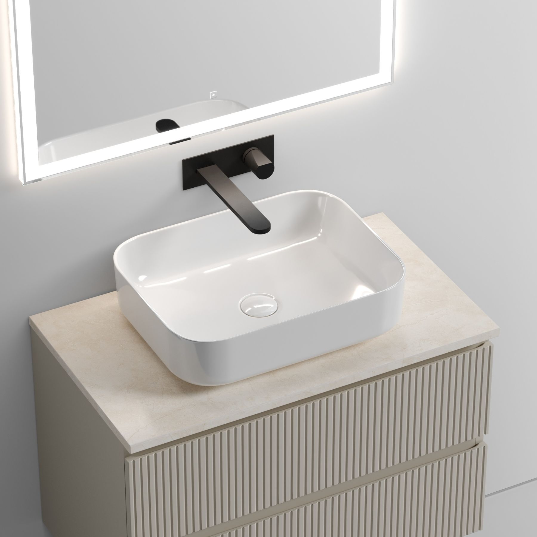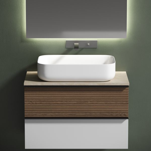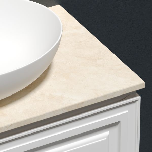 Столешница для ванной комнаты из керамогранита, для установки на подвесную тумбу. C готовым отверстием для установки накладной раковины. Без заранее просверленного отверстия под смеситель.