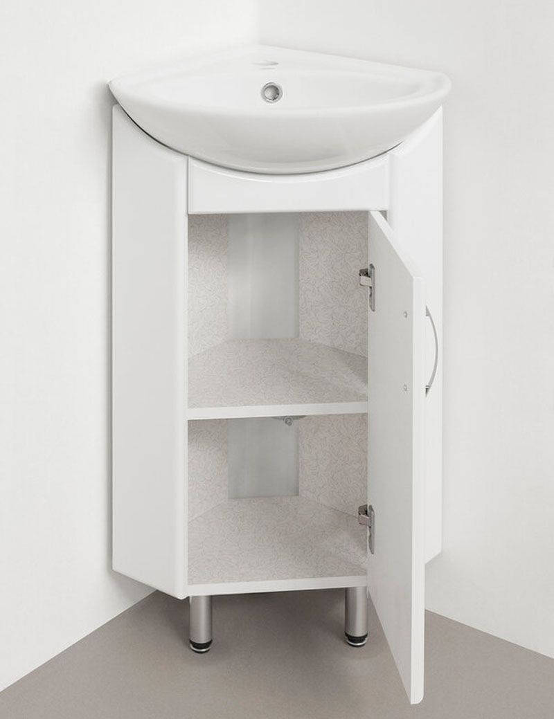 Тумба угловая бренда "Style Line" Эко Стандарт Веер. Фурнитура - хром, эксклюзивный декор "Луино" - ламинация внутренней стороны изделия. Направляющие полного выдвижения Hettich; сборка изделия с помощью эксцентриковых стяжек Hafele; все материалы полностью влагостойкие. Компактные размеры и лаконичный дизайн позволяют легко встроить данную тумбу в интерьеры самых малогабаритных помещений. Данная тумба предусматривает открытую подводку воды