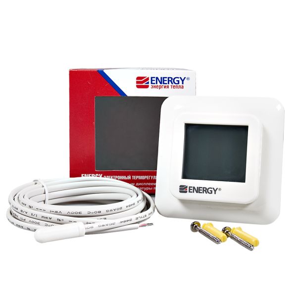 Электронный программируемый терморегулятор Energy TK08 с крупным сенсорным жидкокристаллическим дисплеем и выносным датчиком температуры пола. Предназначен для скрытого утопленного монтажа с использованием стандартной монтажной коробки.Диапазон регулировки температуры: от +5°С до +40°С. Точность настройки 0,5°С и функция программирования снижают расходы на потребляемую электроэнергию на 60-80%.Оснащен функцией программирования с возможностью установки четырех графиков работы теплого пола для рабочих дней недели и двух для выходных дней. Для каждого режима устанавливается время работы и нужная температура. Минимальное время работы каждой программы - 10 минут.Терморегулятор дополнен функцией «ранний старт» - используя данные за предыдущий день работы, прибор вычисляет время, за которое пол нагреется до заданной температуры. На величину этого времени корректируется запуск теплого пола.Управление с помощью пятью сенсорных кнопок. На экране отображаются данные о режиме работы, текущей температуре, дне недели и времени. При нажатии кнопок автоматически включается неоновая подсветка синего цвета.Корпус терморегулятора защищён от конденсата (класс защиты IP 21). Подходит для установки в помещениях с повышенной влажностью.