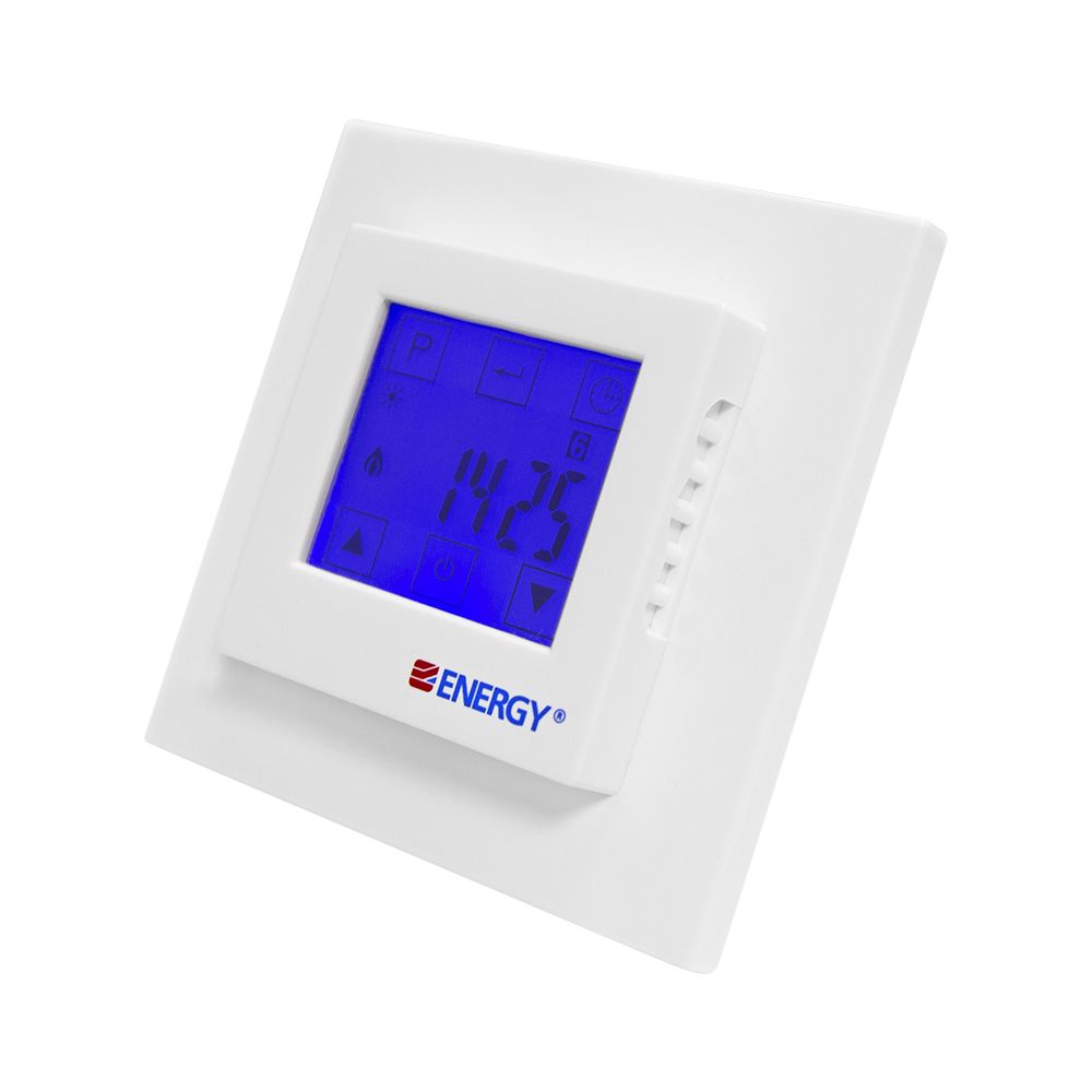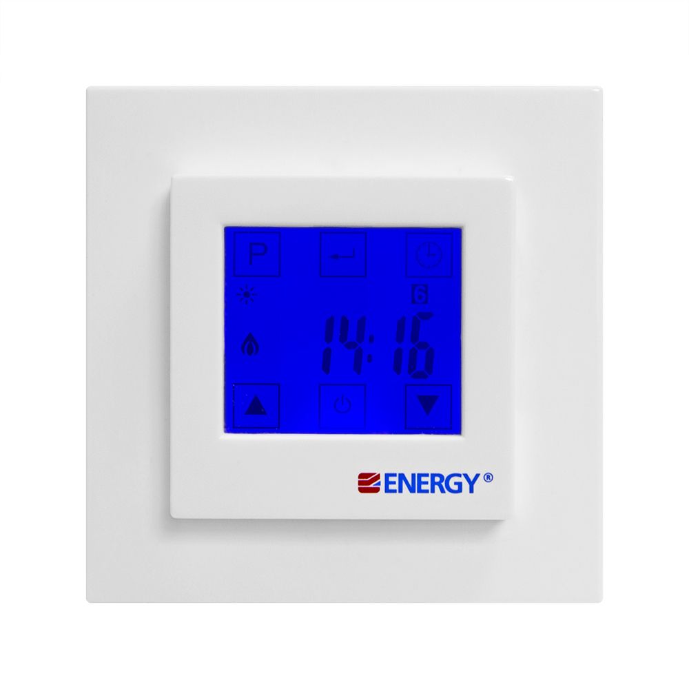 Электронный программируемый терморегулятор Energy TK08 с крупным сенсорным жидкокристаллическим дисплеем и выносным датчиком температуры пола. Предназначен для скрытого утопленного монтажа с использованием стандартной монтажной коробки.Диапазон регулировки температуры: от +5°С до +40°С. Точность настройки 0,5°С и функция программирования снижают расходы на потребляемую электроэнергию на 60-80%.Оснащен функцией программирования с возможностью установки четырех графиков работы теплого пола для рабочих дней недели и двух для выходных дней. Для каждого режима устанавливается время работы и нужная температура. Минимальное время работы каждой программы - 10 минут.Терморегулятор дополнен функцией «ранний старт» - используя данные за предыдущий день работы, прибор вычисляет время, за которое пол нагреется до заданной температуры. На величину этого времени корректируется запуск теплого пола.Управление с помощью пятью сенсорных кнопок. На экране отображаются данные о режиме работы, текущей температуре, дне недели и времени. При нажатии кнопок автоматически включается неоновая подсветка синего цвета.Корпус терморегулятора защищён от конденсата (класс защиты IP 21). Подходит для установки в помещениях с повышенной влажностью.Данный терморегулятор совместим с рамками других производителей, таких как Schneider, Gira, Jung и ABB.