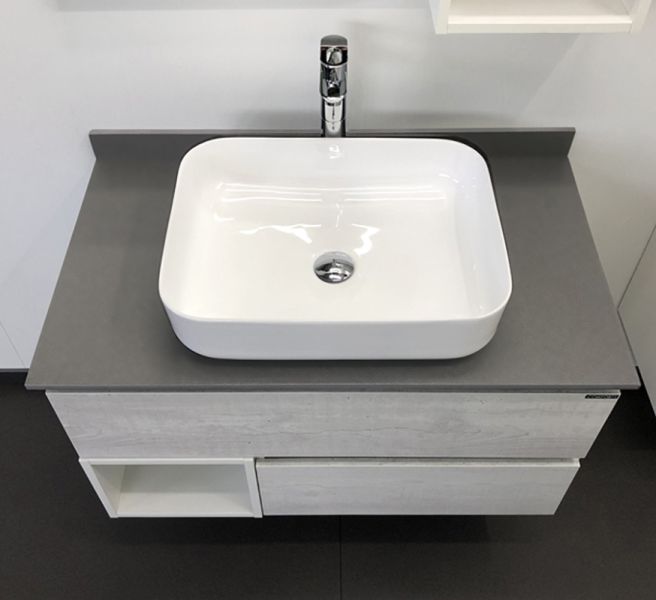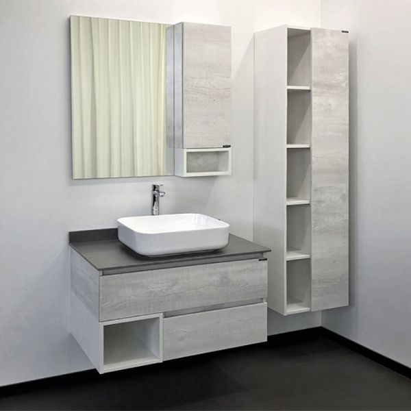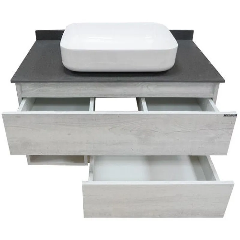 Комплектация: накладная раковина Comforty T-Y9378, столешница из керамогранита. Оба ящика оснащены направляющими с функцией плавного закрывания.