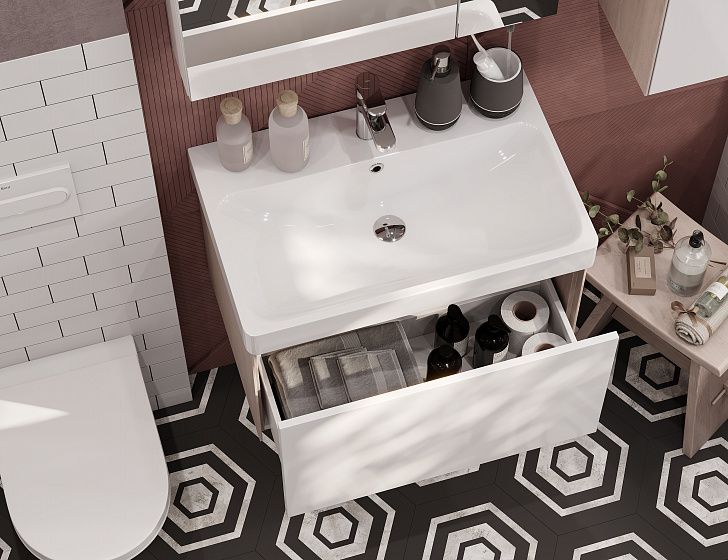 Белые фасады тумбы под раковину Асти 70 идеально сочетаются с боковыми стенками, выполненными в сдержанной древесной отделке Ясень Шимо Светлый: особенно органично она будет смотреться в интерьерах с отсылками к скандинавской эстетике. Сочетание цветов (белый глянец и ясень шимо) в коллекции АСТИ позволяет использовать мебель в современных интерьерах. Ящик тумбы оснащен механизмом Push-to-Open, гарантирующим плавное открывание и закрывание. Отличительная особенность мебели из коллекции - боковые стенки, при изготовлении которых используется особая инновационная технология. Благодаря ей создается эффект визуально тонких боковых линий, однако конструкция при этом остается надежной и прочной. Пространство для хранения в ящике тумбы можно организовать так, как удобно именно вам. Тумбы АСТИ комбинируются с раковиной Адриана бренда Santek.