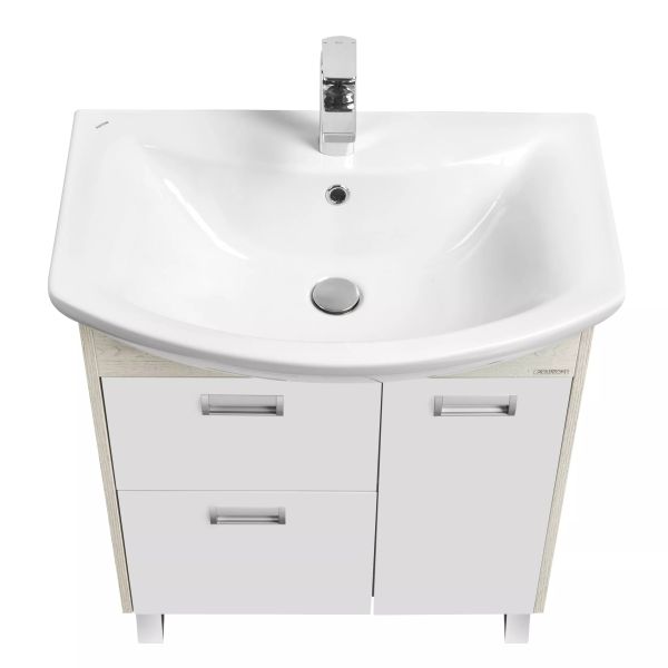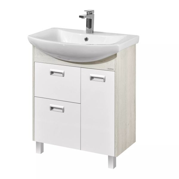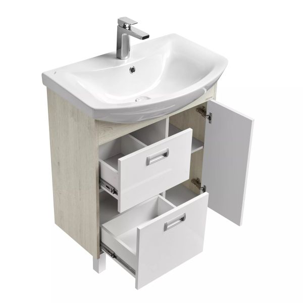У тумбы размера 70 см слева расположены два ящика полного выдвижения, а справа - фасад-створка, петли с доводчиками. В комплект входит регулируемая по высоте полка. Тумбы установлены на металлические ножки и укомплектованы практичными врезными ручками, которые очень удобны в использовании. Боковые стенки и фигурная планка под раковиной изготовлены из ламинированной, текстурированной влагостойкой ЛДСП в цвете дуб сомерсет, а фасады - из крашеной в белый цвет влагостойкой ЛДСП.