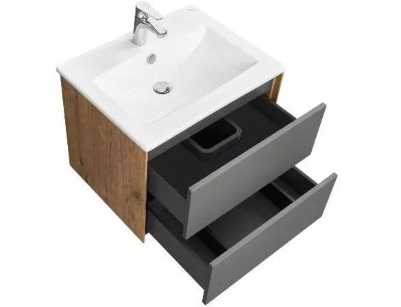 Тумба Сохо 60 функционально состоит из двух вместительных ящиков, оснащенных системой push to open, обеспечивающей надежное, комфортное и бесшумное закрывание. Фасады изделия – МДФ в пленке графит с эффектом soft touch, корпус – ламинированная влагостойкая ДСП Дуб веллингтон. Верхний и нижний ящики оснащены системой организации пространства, которая позволяет содержать косметические средства в идеальном порядке. Дополняет тумбу стильная раковина Элина от бренда Santek с удобной чашей. Все внутренние детали тумбы выполнены в тон фасадов – цвета антрацит.