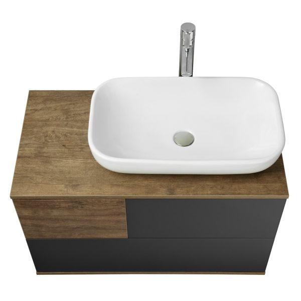 - Текстуры на тумбе Терра 85 расположены ассиметрично: столешница, корпус и вставка на верхнем ящике - влагостойкое ДСП с текстурой дуб кантри, фасады ящиков - матовая серая пленка антрацит