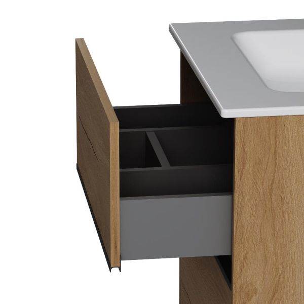 Два вместительных ящика на направляющих Soft-close скрытого монтажа, которые обеспечивают плавное и бесшумное открывание и закрывание - использование тумбы максимально комфортное. Элегантная черная акцентная металлическая профильная ручка придает изделию современный и стильный вид, подчеркивая его уникальность. Самые популярные цвета: белый глянцевый для создания светлого и воздушного пространства, и под натуральное дерево, который добавит тепла и уюта в ваш интерьер.
