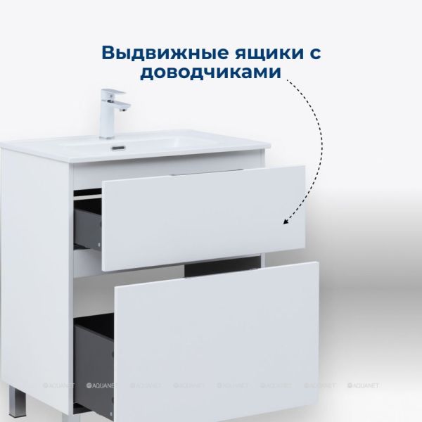 Тумба под раковину Aquanet Алвита New 70 напольная, белый матовый. Внутренние детали изготовлены из влагостойкой ЛДСП в цвете антрацит.