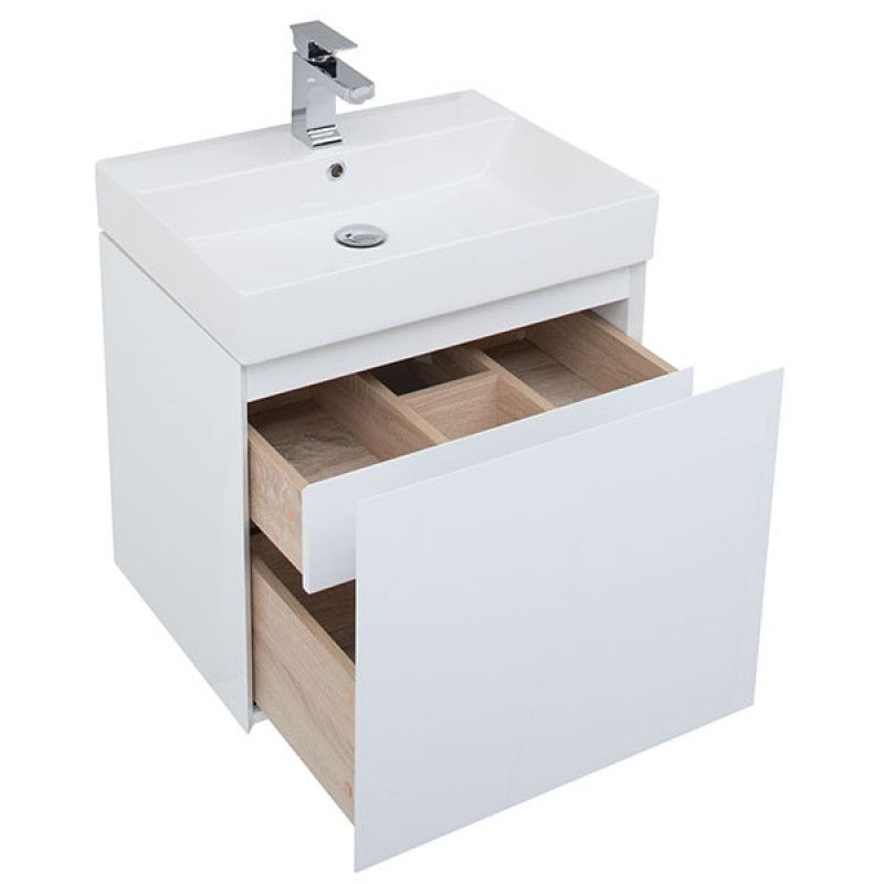 Тумба под раковину Aquanet Йорк 60 кажется довольно-таки простой внешне, но за видимой простотой кроется тщательная работа над каждой линией, над каждой деталью. Обратите внимание на интегрированную ручку, которой по сути не видно, но при открывании выдвижного ящика она поражает удобством использования. Радует глаз зеркальная чистота глянцевой поверхности фасада из МДФ. Мебель белоснежная. Цветовой акцент появляется при выдвижении ящика тумбы, так как внутренние детали сделаны в цвете «дуб сонома». Сочетание выглядит благородно и эстетично, при этом не изменяя общей идее лаконичности во всем. Ящик в тумбочке один, но внутри него прячется еще одна зона хранения, в которой можно разложить по местам разнообразные мелочи. Направляющие с доводчиками, так что при открывании и закрывании ящикам обеспечен плавный ход и отсутствие неприятных стуков. Тумба шириной 60 см комплектуется керамической раковиной Sanovit. Она может быть как подвесной, так и напольной – на выбор покупателя.