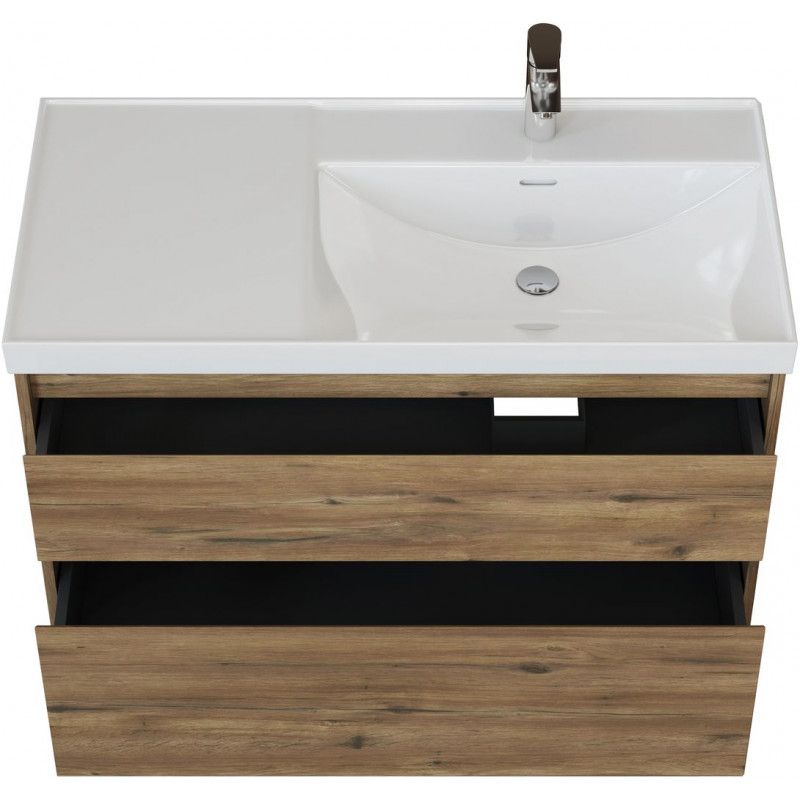 Стильная и практичная тумба для ванной комнаты с продуманной конструкцией. Модель Aquanet Nova Lite 2.0 100 выполнена в цвете дуб рустикальный – матовое покрытие имитирует фактуру натурального дерева и не оставляет отпечатков пальцев.