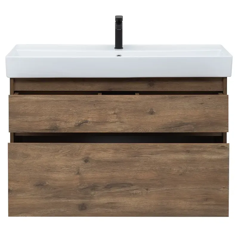 Тумба под раковину в ванную комнату бренда Aquanet выполнена в стиле модерн и входит в нашу коллекцию мебели Nova Lite. Представленная коллекция мебели для ванных комнат осчастливила сотни покупателей, так как они приобрели сочетание дизайна, качества и функциональности. Важный момент при выборе тумбы для умывальника / раковины - это материалы. Они должны быть адаптированы к эксплуатации в условиях повышенной влажности. Влагостойкий ЛДСП - материал, из которого выполнен корпус изделия, фасад - из влагостойкого ЛДСП. При монтаже напольной/подвесной тумбы в первую очередь необходимо учесть ширину, которая равна 95 см. Тумба в цвете коричневый (дуб рустикальный) освежит Вашу ванну и будет отлично сочетатся с сантехникой. Тумба в ванную также обеспечит вам экономию места, так как в ней предусмотрены вместительные ящики, оснащенные механизмом доводчика.