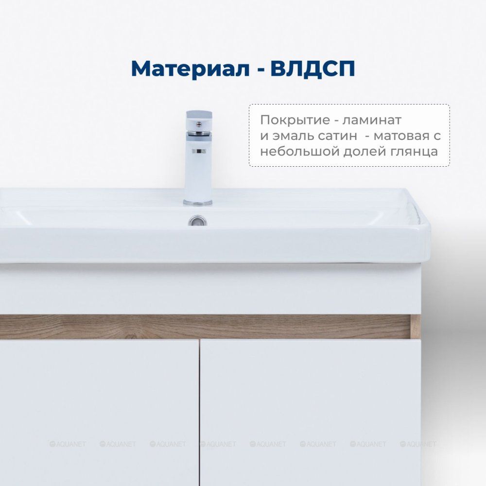 Корпус тумбы выполнен из влагостойкой ЛДСП с ламинированным покрытием, что гарантирует долговечность и устойчивость к воздействию влаги. Фасады также изготовлены из влагостойкой ЛДСП, обеспечивая единый стиль и надежную защиту от деформации.