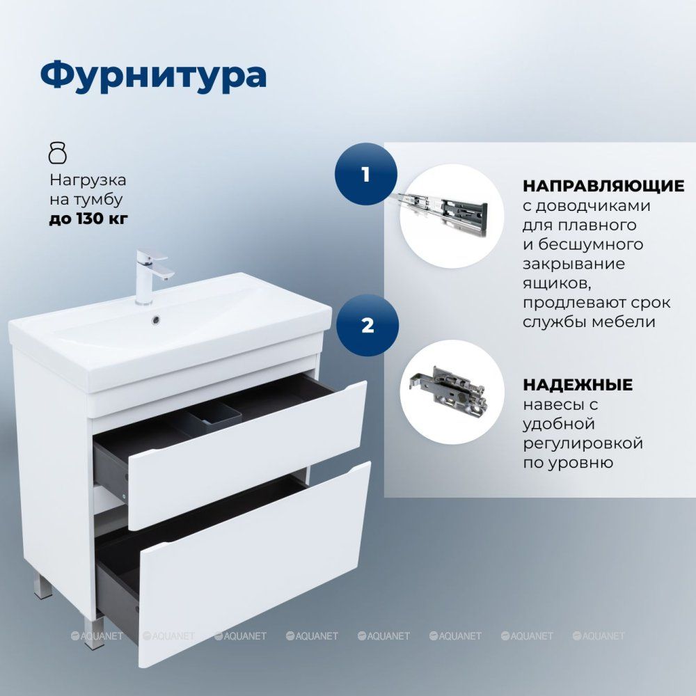 Тумба под раковину Aquanet  Слим 80 напольная, белый сатин – компактное и функциональное решение для ванной комнаты. Она сочетает лаконичный дизайн и продуманные детали. Глубина тумбы с раковиной составляет 405 мм, что делает её удобной даже для небольших помещений.